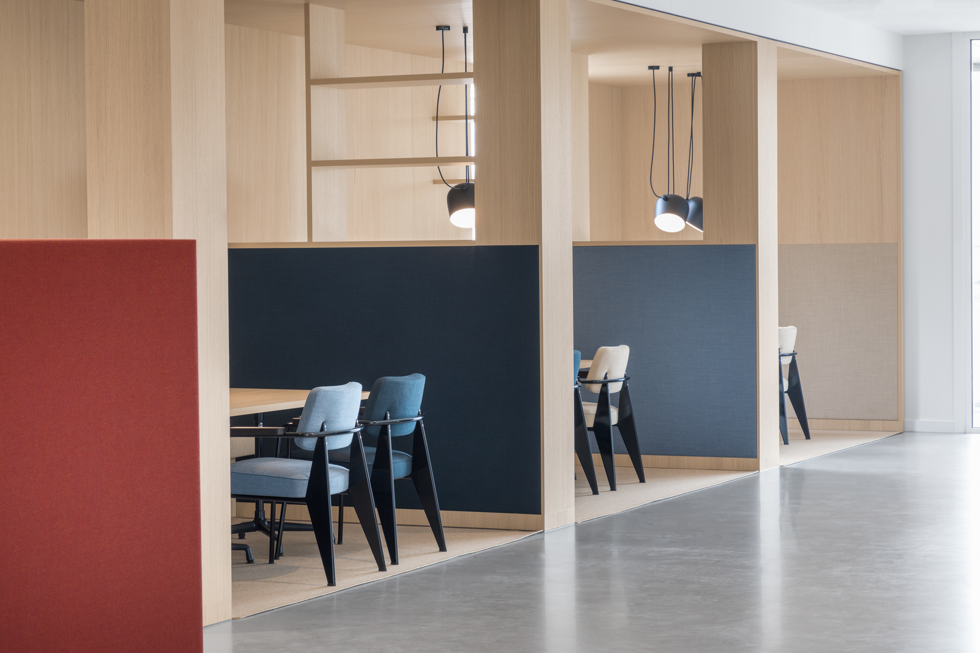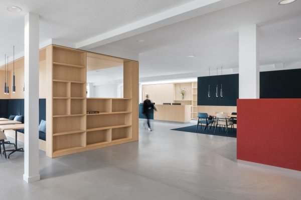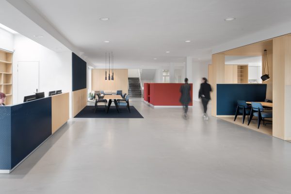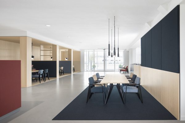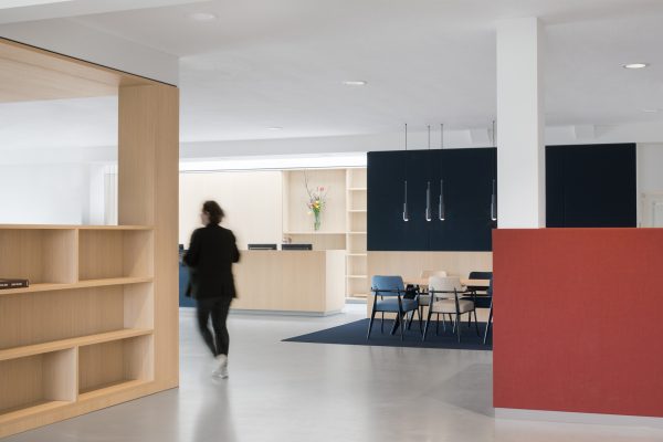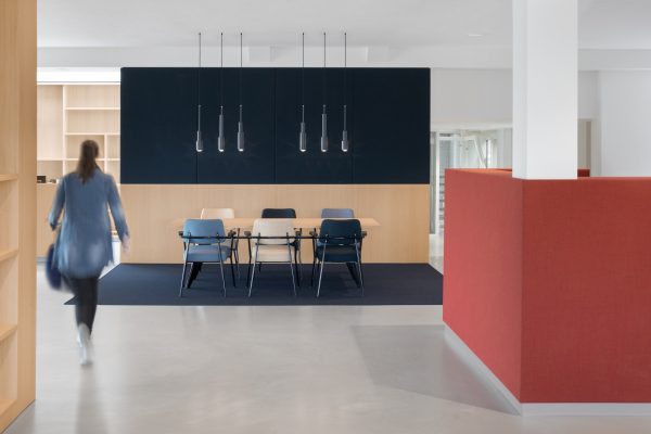 Op maat gemaakte kasten en houten objecten verdelen de ruimte en creëren openheid. We hebben met kleuren en materialen gespeeld om verschillende ruimtes met elkaar te verbinden. Een aantal vergaderruimtes van hout en textiel garanderen een perfecte akoestiek en absolute discretie.